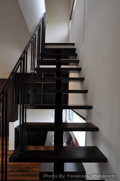 - オールド感たっぷりな無垢の床材が空間の引きたて役に、そして軽快なスチール階段もリビングにいい意味のリズム感を与えています