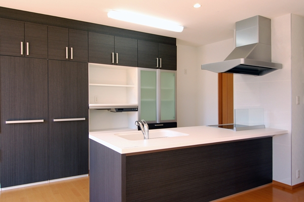 キッチンはフラットタイプを採用リビング全体を見渡しつつ必要に応じて仕切れるよう引込み戸を設けました。背面キャビネットの収納力的に申し分のないボリュームを確保しています