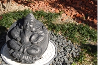 庭廻りの詳細です。排水用のマンホールに大黒天がデザインされた瓦をのせています。遊び心がただよってきます。レンガを砕いた砂利と芝生の色分けもそんな遊び心の一環です。