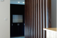 格子壁を真正面に見た構図です。リビングはこの写真でも分るように吹抜空間となっています。格子壁に囲われた部分は実は2階へ通じる階段となっていますが、その一つ奥まった壁にも格子を配置しています。それが天井に突き刺さり隙間から光が漏れています。和の空間で大事な陰影感を演出することが出来ました。