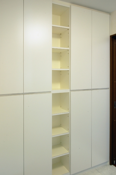 洗面所に取り付けた壁面収納です。バスタオルや着替えなどのあまり奥行きを必要としないものを仕舞いこむ収納です。適材適所で収納のデザインや形が変わります。