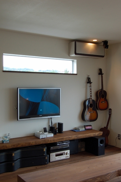 リビングにはテレビ、そして趣味で弾くことがあるアコースティックギター。クライアントがおしゃれなライフスタイルの持ち主であることを物語っています。テレビの真下にあるカウンターは特性の杉の厚板で製作しました。一見無機質な内装イメージとそういった有機質なものとの混成がこの家の面白さだと考えます。