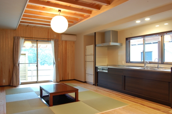 新しく設けたリビングの全景です。杉のフローリングの中に畳の間を切り込みました。そして掘りごたつもそなえています。天井には昔の力天井を思わせるデザインを施しています。木が与える素朴さや風合いは日本人にとっては欠かせないものかもしれません。